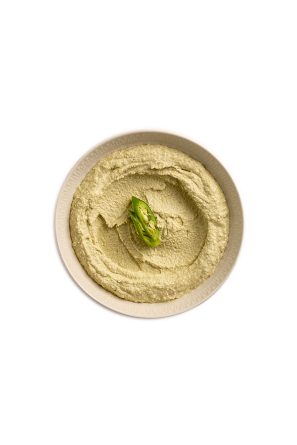 Kikherne 48 % (Kanada), vesi, - 9 %, rapsiöljy, vihreä chili pepperoni, pinaatti, sitruunatäysmehu, valkosipuli, mausteet (mm. mustapippuri), merisuola, sokeri, säilöntäaineet (sitruunahappo, kaliumsorbaatti)