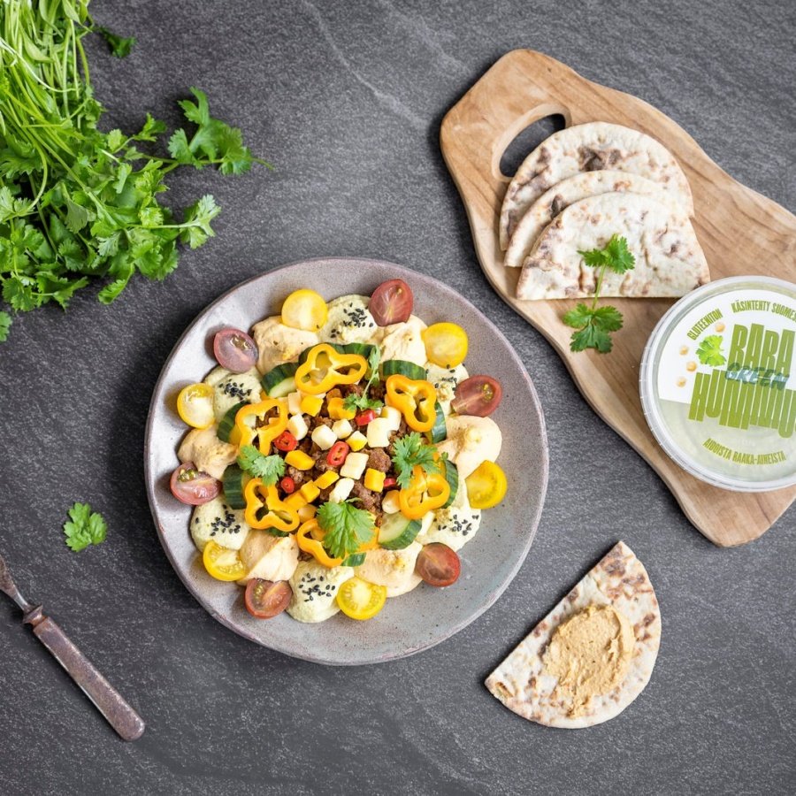 Pursota tai lusikoi Green Hummus ja Chili Hummus vieretysten keoiksi lautasen ympäri. Paista jauheliha kuumalla pannulla kauttaaltaan ja mausta tacomausteella. Lisää pannulle hienonnettua valkosipulia ja sipulia ja paista vielä hetki. Laita jauheliha lautasen keskelle. Laita päälle cheddarjuustokuutioita ja paloiteltua kurkkua ja kirsikka- tai miniluumutomaatteja. Koristele annos korianterilla, mustilla seesaminsiemenillä ja chiliviipaleilla.