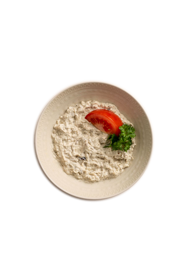 Aubergine 60 % (EU), majonnäs (rapsolja, äggulasenapsfrö, socker, ättika, salt), sesampasta, rapsolja, lök, vitlök, havssalt, socker, svartpeppar, rökarom, konserveringsmedel (kaliumsorbat)