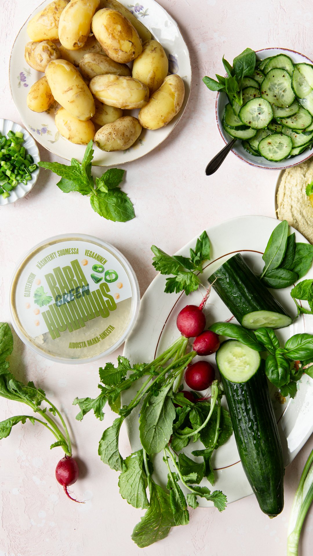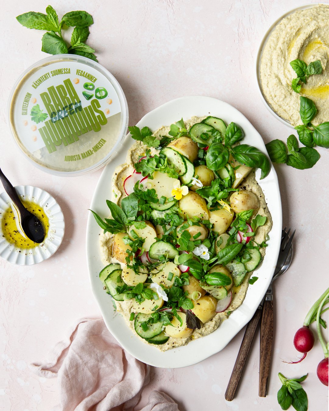 • Aloita salaatin kokoaminen levittämällä hummus tarjoiluvadille. Lisää babypinaatti ja hienonnetut yrtit. Lisää sitten perunapalat, retiisisiivut, kurkut ja kevätsipulia.