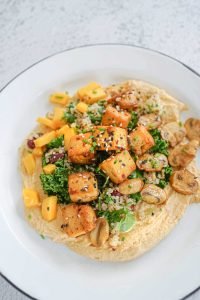 Kokoa annos: aloita hummuksella ja sivele lautasen pohjalle 4 ruokaluskallista (noin 1 dl) hummusta. Lisää seuraavaksi salaatti ja lopuksi paistetut tofukuutiot.
